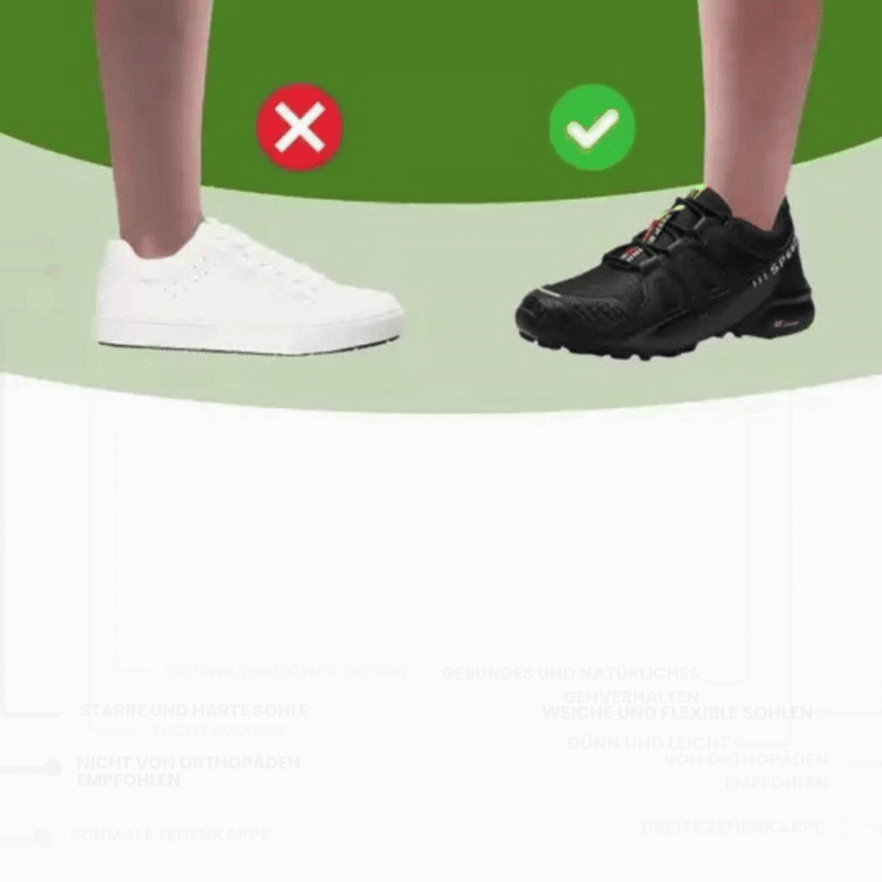 Traditionelle Schuhe mit steifen Sohlen und schmalem Design können jeden Schritt zur Qual machen. Unsere orthopädisch empfohlenen Walkingschuhe verfügen über eine revolutionäre breite Zehenbox und ein flexibles Sohlendesign, das mit der natürlichen Bewegung Ihres Fußes arbeitet – nicht dagegen.